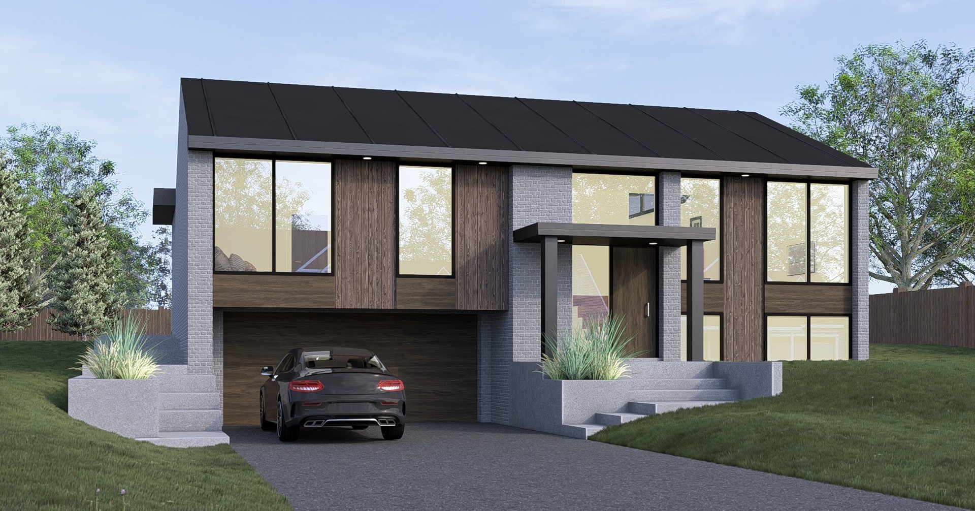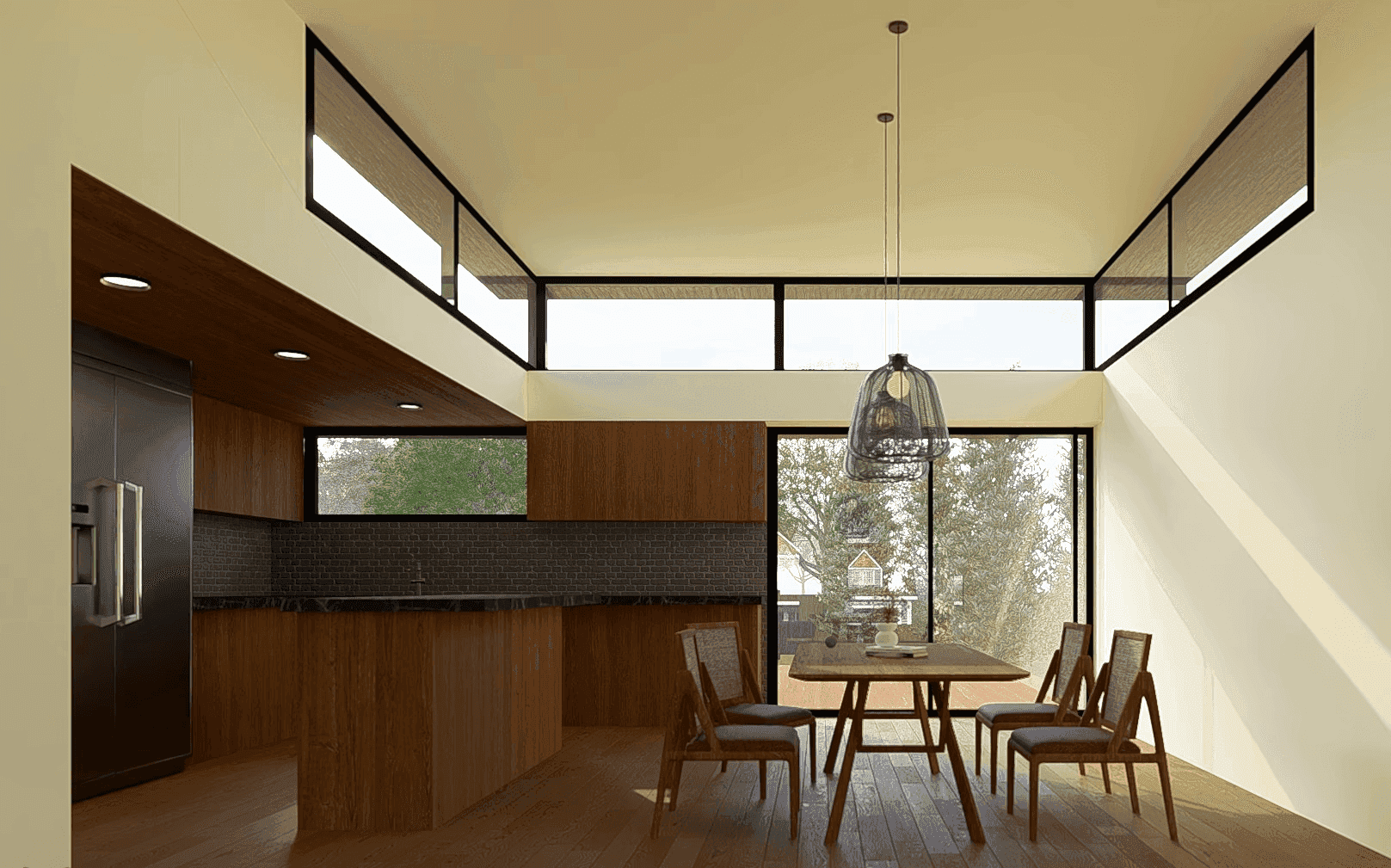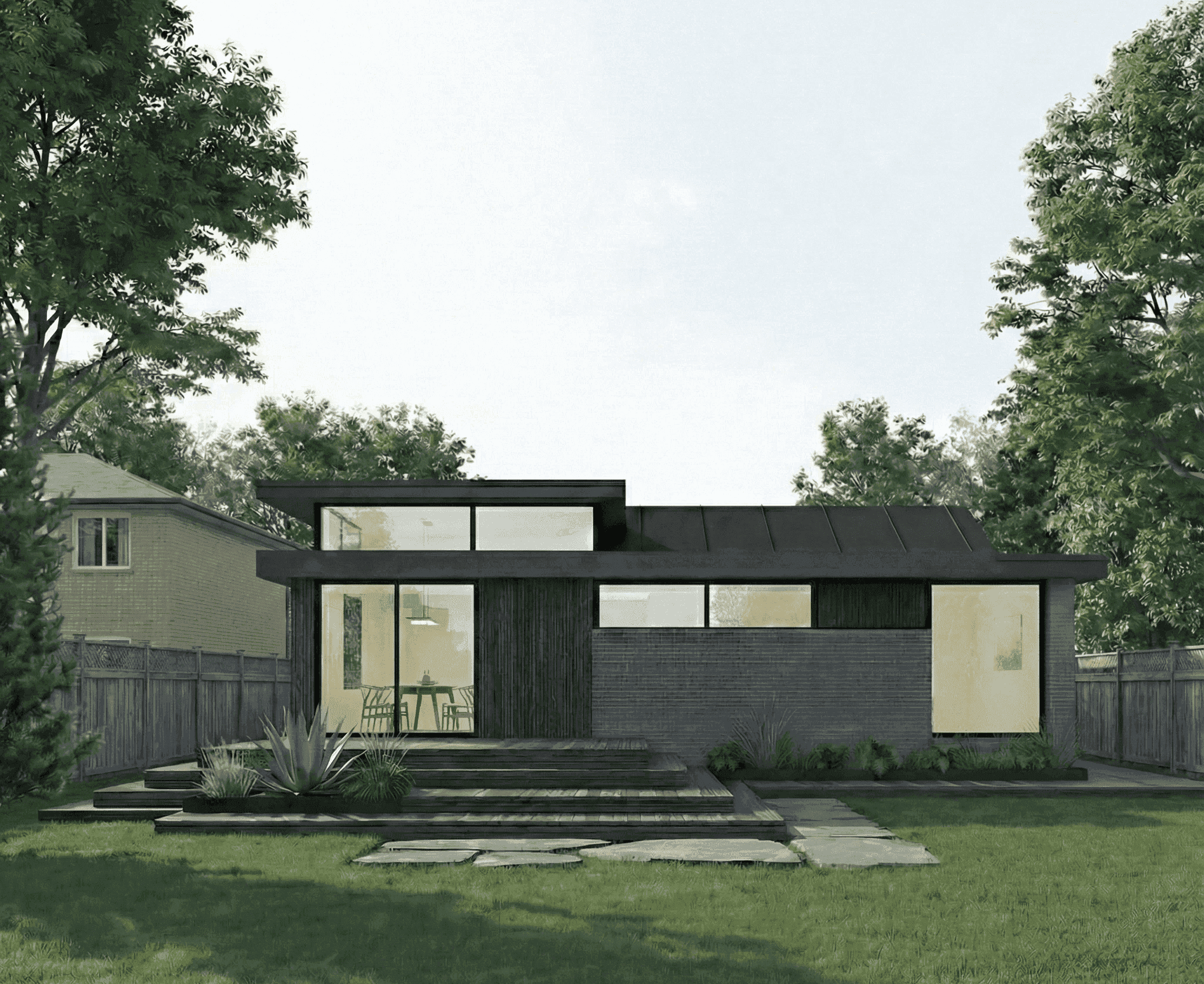 Dan's New Build features a facade of grey brick, vertical wood cladding, and expansive glass. Inside, high clerestory windows wash the open-concept living area in natural light while maintaining complete privacy.